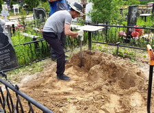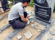 Первым делом мы подготовили участок к работам: демонтировали уже установленное надгробье, а также разровняли почву на могиле, тем самым подготовив её к укладке наземного покрытия.